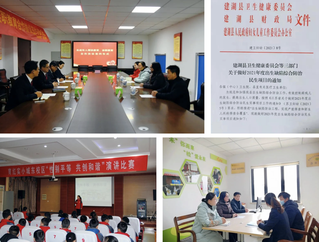 建湖县科学编制县级“十四五”妇女儿童发展专项规划,在规划中增设妇女儿童相关目标任务,进一步促进妇女儿童事业与经济社会同步协调发展。依托妇儿工委办平台,推动出台《建湖县推进3岁以下婴幼儿照护服务工作实施方案》等政策性文件,协调推进“性别平等进校园”、婚孕检与婚姻登记一站式服务,整合资源办好出生缺陷综合防治等实事项目,从源头维护妇女儿童合法权益。发挥女人大代表、女政协委员作用,加强对未成年人违法情况的调查研究,通过专项督查推动落实侵害未成年人强制报告制度、与未成年人密切接触行业入职查询制度和“一站式”问询制度。