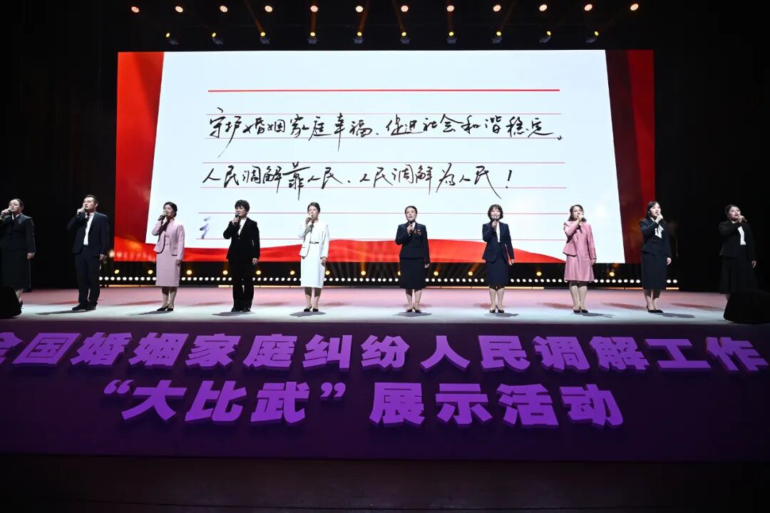 总决赛采用分段晋级模式,设置了笔试考察、知识竞答、模拟调解等环节,来自全国31 个省(区、市)和新疆生产建设兵团的32支代表队、96名调解员同台竞技,经过两天激烈角逐,最终产生了一等奖1名、二等奖5名、三等奖10名以及优秀奖80名。展示活动以“守护婚姻家庭幸福 促进社会和谐稳定”为主题,现场发布了全国婚姻家庭纠纷调解工作典型案例、婚姻家庭纠纷“总对总”在线诉调对接机制,宣布“全国婚姻家庭纠纷人民调解人才库”正式建立,集中展示了新时代婚调工作者的卓越风采,生动讲述了家文化传承与基层治理深度融合的中国调解故事。全国妇联副主席、书记处书记林怡,外国驻华使节、国际组织驻华代表观摩了决赛环节。