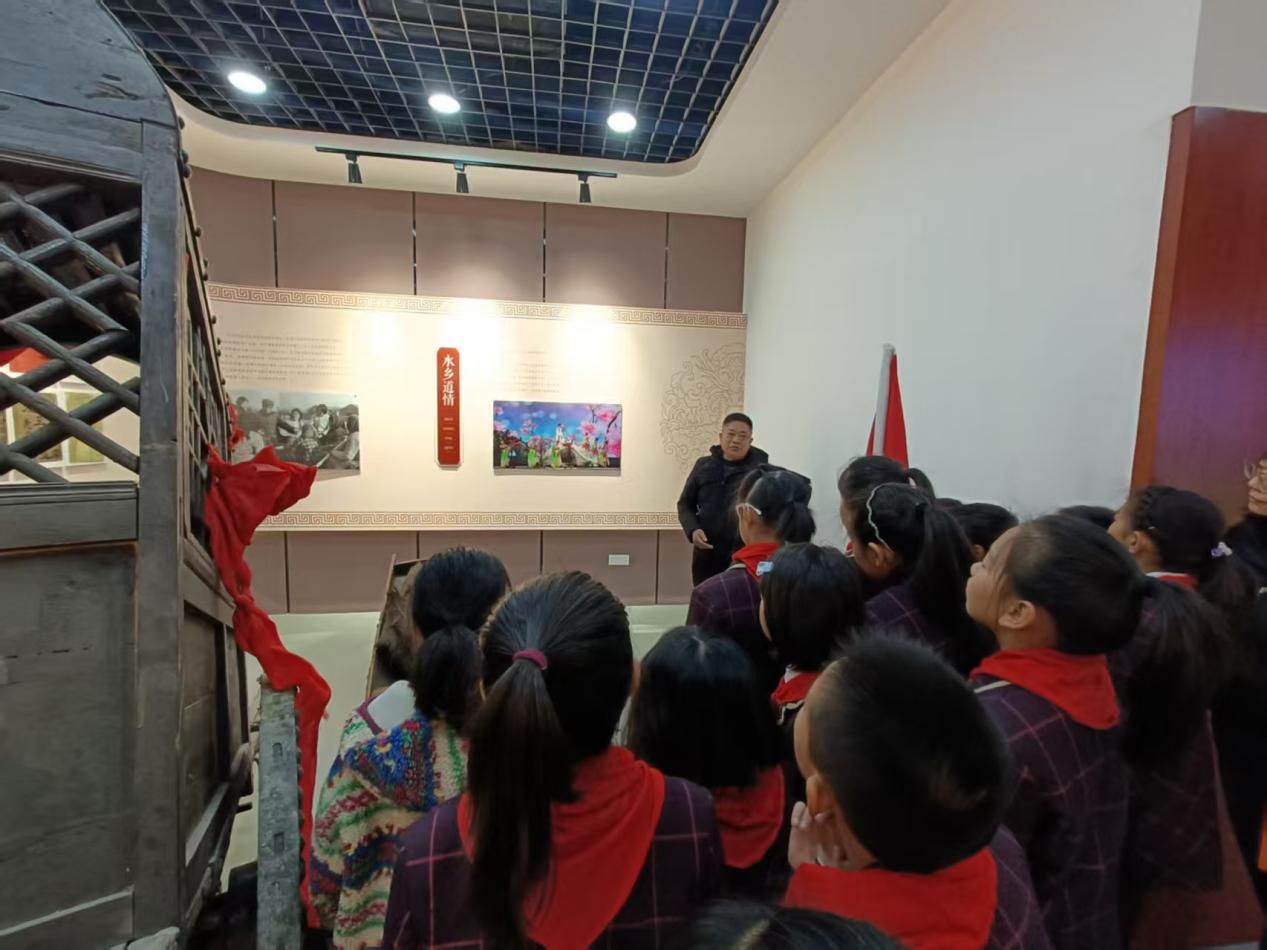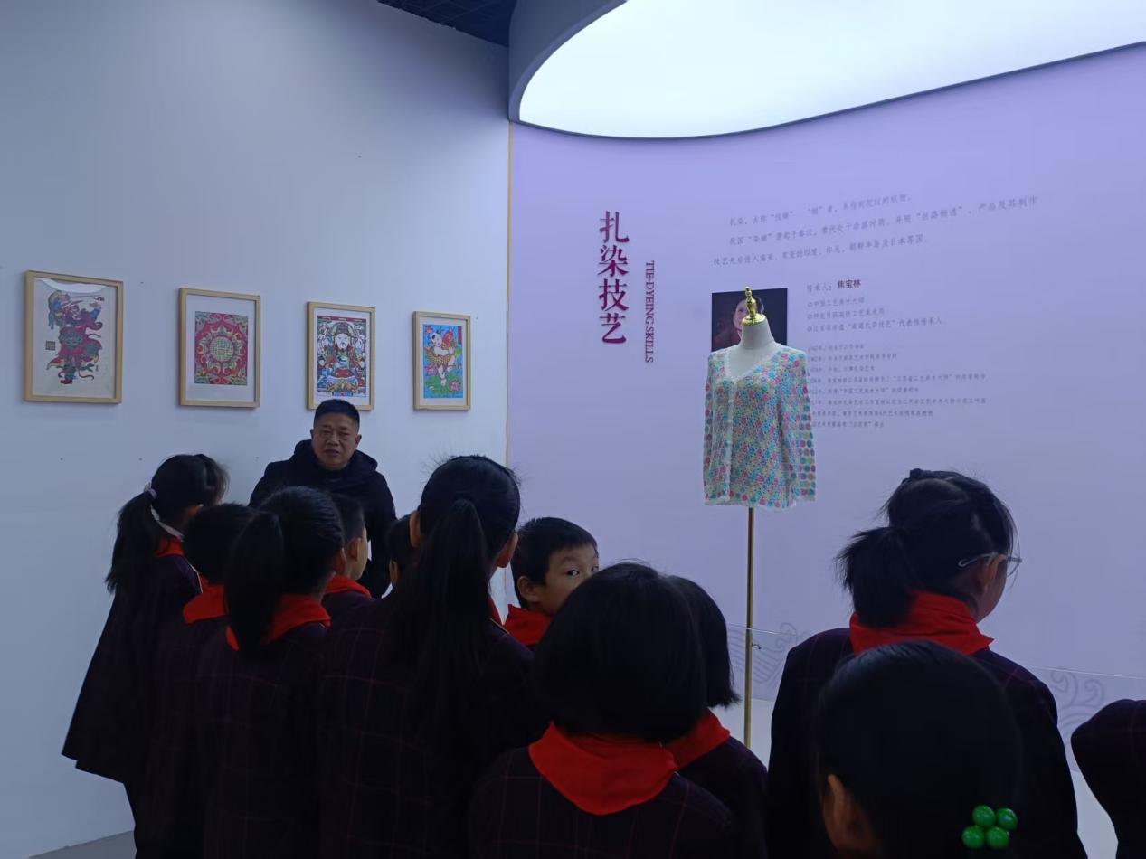 青灰色的场馆内,讲解员带队,通过引导少先队员们观看文字图片、驻足实物展示、聆听视听放映等方式,串联起海安非遗的历史脉络。讲解中,孩子们依次了解了海安花鼓、莲花落、苍龙舞、水乡道情、扎染技艺等11个省级非物质文化遗产项目,还先后走进“传统舞蹈”“传统音乐”“传统技艺”“传统美术”等特色展厅深入探寻。在水祥道情展区,老式渔鼓、简板等乐器静静陈列在展柜中,旁边的屏幕正播放着非遗传承人演唱的片段,悠扬婉转的曲调伴着质朴的方言歌词,瞬间将大家带入水乡的晨雾与暮色中。讲解员介绍:“水乡道情是咱海安渔民的‘心头歌’,过去渔民在船上劳作时,就靠敲渔鼓、唱道情解乏,歌词里全是水乡的生活故事。”