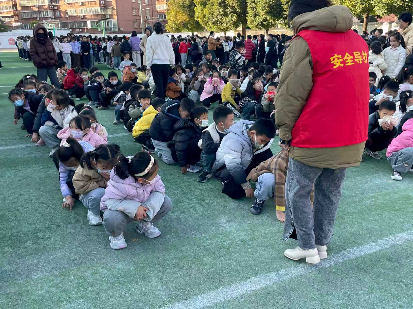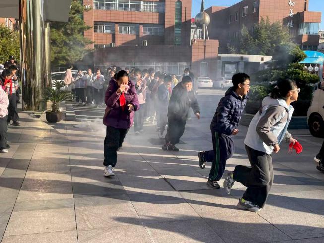 警报声响起的瞬间,各班级老师迅速组织学生捂住口鼻,弯腰低姿,沿着教学楼两侧的安全通道快速有序撤离,社区网格员提前在楼道转角、楼梯口等关键位置值守,提醒学生“不要推挤”“保持间距”,协助老师疏导人流。从警报拉响到全体师生安全抵达操场指定区域,整个过程仅用时3分20秒,做到了快速、安全、有序,充分展现了前期演练筹备的扎实成效。
